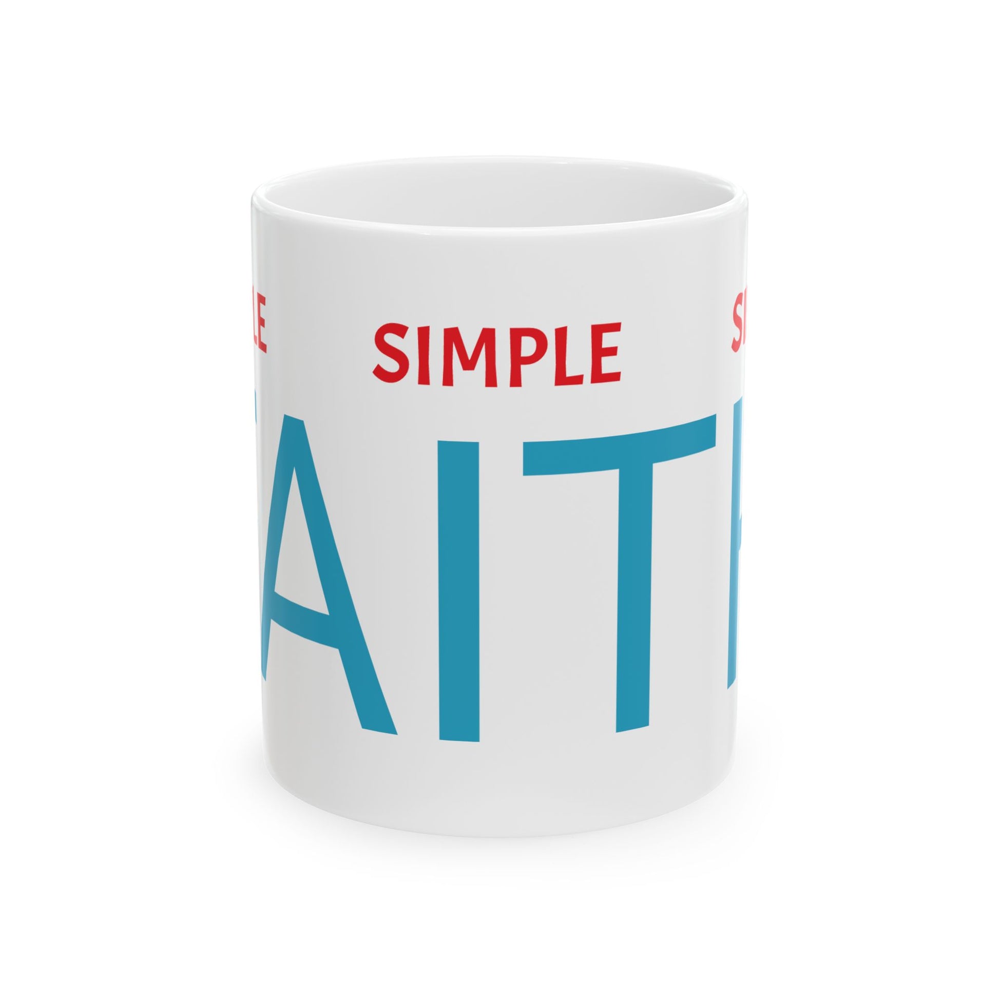 SIMPLE FAITH coffee mug (11oz) Warm-up with a nice drink with SIMPLE FAITH out of this customized ceramic coffee mug. Personalize it with cool designs, photos or logos to make that "aaahhh!" moment even better. It’s BPA and Lead-free, microwave & dishwasher-safe, and made of white, durable ceramic in 11-ounce size. Thanks to the advanced printing tech, your designs come to life with incredibly vivid colors – the perfect gift for coffee, tea, and chocolate lovers.